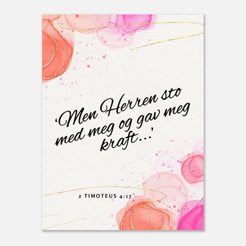 Denne høykvalitets vakre halvblanke plakaten bærer et av de mest kjente og trøstende bibelversene fra 2. Timoteus 4:17: "Men Herren sto med meg og gav meg kraft..." Med sitt myke design, dekorative rosa akvarell-elementer og elegante typografi, passer denne plakaten perfekt inn i ethvert moderne hjem. Enten du ønsker en daglig påminnelse om styrke i hverdagen eller leter etter en meningsfull gave til en venn, er dette et stilrent og inspirerende valg.