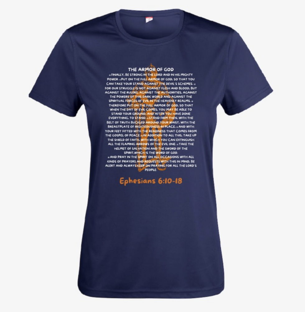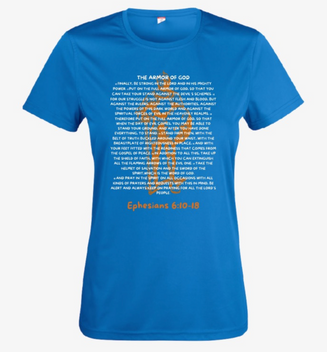 Introducing our Lady Performance T-shirt, perfect for the gym or any active lifestyle. This t-shirt features the empowering Ephesians 6:10-18 scripture, serving as a reminder of strength and resilience. Made from 100% polyester, this t-shirt is not only durable but also breathable and moisture-wicking, keeping you comfortable during your workouts. Show off your faith while staying comfortable and stylish with this versatile performance t-shirt.