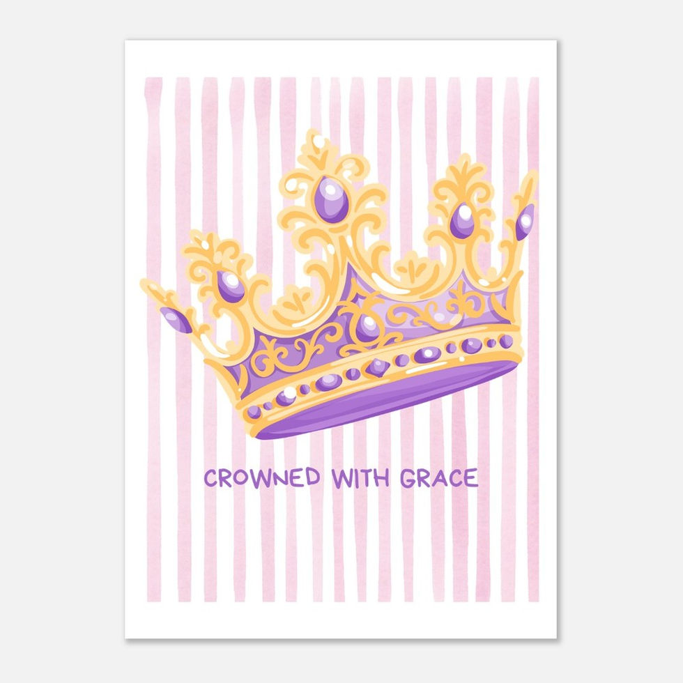 Themes: Crowned with Grace, Royal Wall Art, Inspirational Quotes, Tiara Illustration, Gold and Purple Decor. Specs: Semi-glossy Art Paper, Sustainable Fine Art, 170gsm Silk Print, High-quality Poster. Artist: Hilde Karin Knutsen, His Kingdom Designs, March 2026.