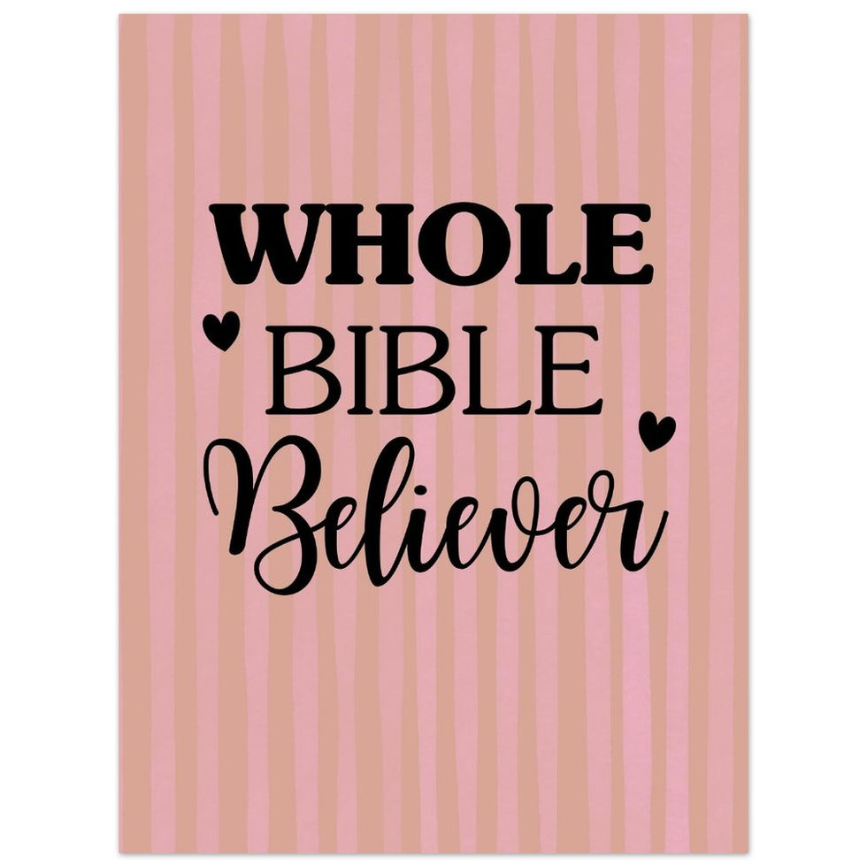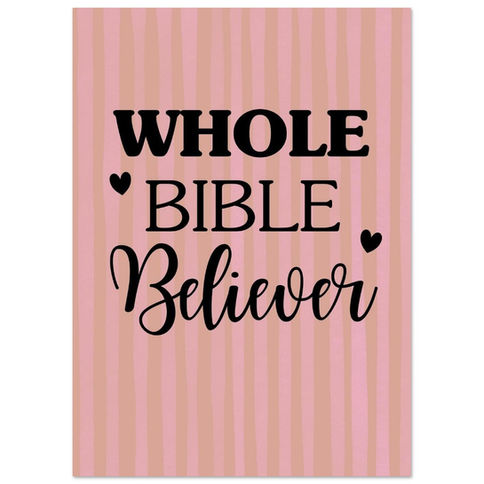 The "Whole Bible Believer" poster is a beautiful fusion of modern design and timeless conviction. Featuring three distinct, harmonizing fonts—heavy block lettering, sophisticated serifs, and flowing calligraphy—this piece is framed by two minimalist hearts on a warm, striped pink backdrop. It’s an ideal addition to a home office, prayer room, or as a thoughtful gift for a believer with a keen eye for style.